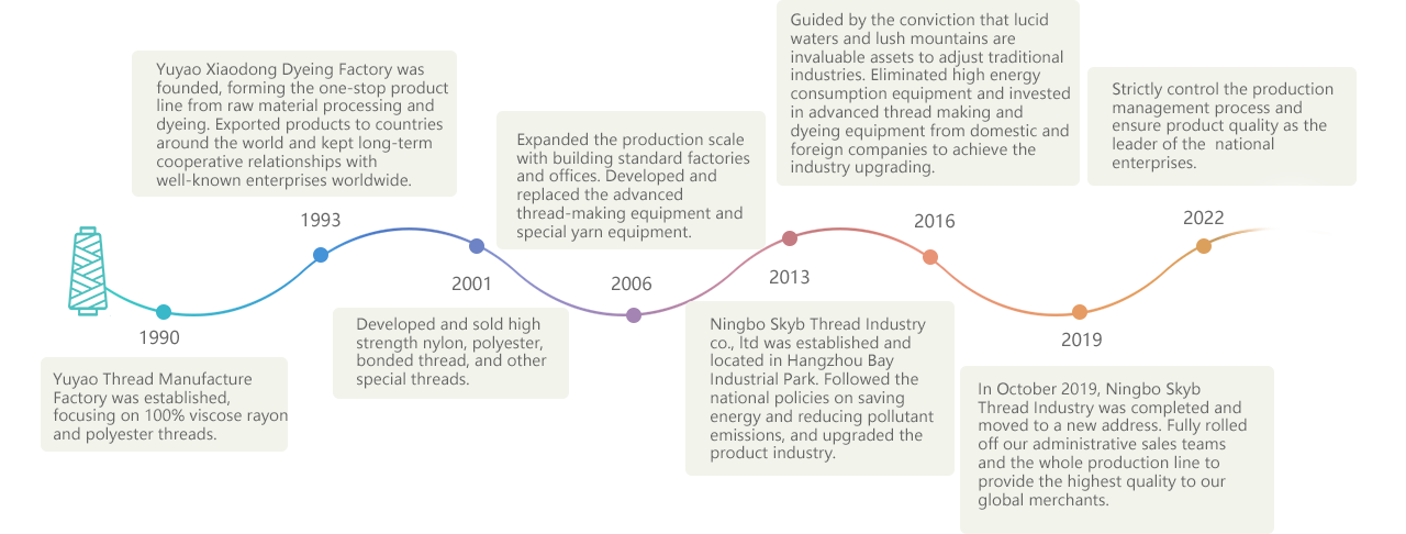 Ningbo Skyb Thread Industry Co.,Ltd is an enterprise with self-managing Imp.& Exp.Right,specialized in developing and manufacturing kinds of yarn and thread.After more than 10 years of hard work and development,we have grown up as one of the biggest thread manufacturers in China.Located in the west suburban of Yuyao City,Zhejiang Province,closes to the Shanghai-Hangzhou-Ningbo Expressway,50KM away from Ningbo Airport,80KM from Xiaoshan Airport,75KM from the Ningbo Seaport,300KM from Shanghai Seaport and Airport,our traffic is very convenient. Ningbo Skyb Thread Industry Co.Ltd is our new factory located In Binhai New City,Economic Development Zone,Yuyao.